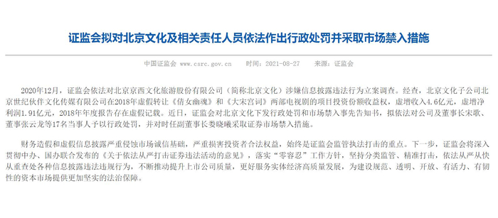 中新经纬客户端8月27日电 27日盘后,证监会公告称,拟对北京文化及相关责任人员依法作出行政处罚并采取市场禁入措施。