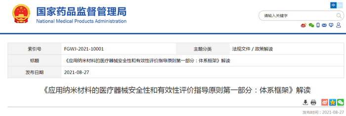 原标题:《应用纳米材料的医疗器械安全性和有效性评价指导原则第一部分:体系框架》解读 来源:国家药监局网站