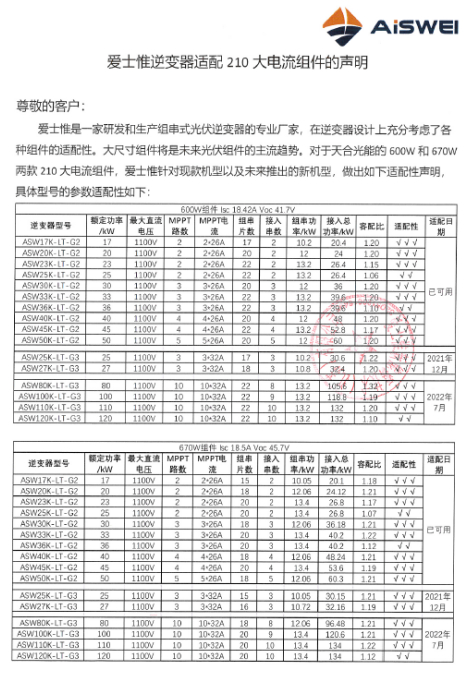 ▲7月20日,爱士惟发布声明,宣布目前已在供的17kW~120kW分布式逆变器可以匹配210超高功率组件。