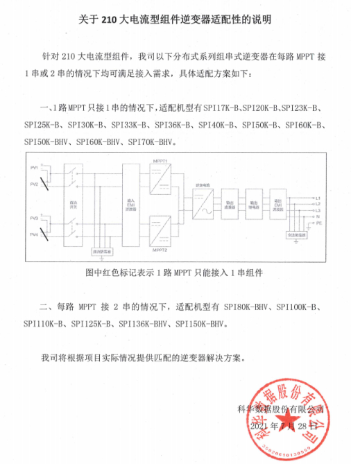 ▲8月26日,科华发布声明,宣布目前已在供的20kW~100kW分布式逆变器可以匹配210超高功率组件。