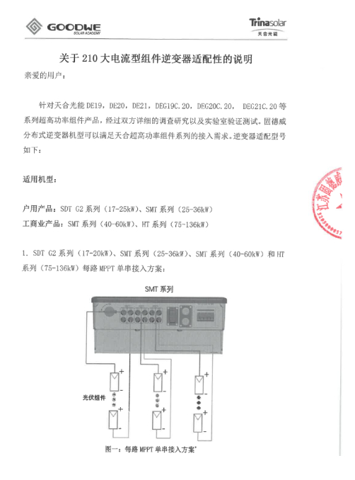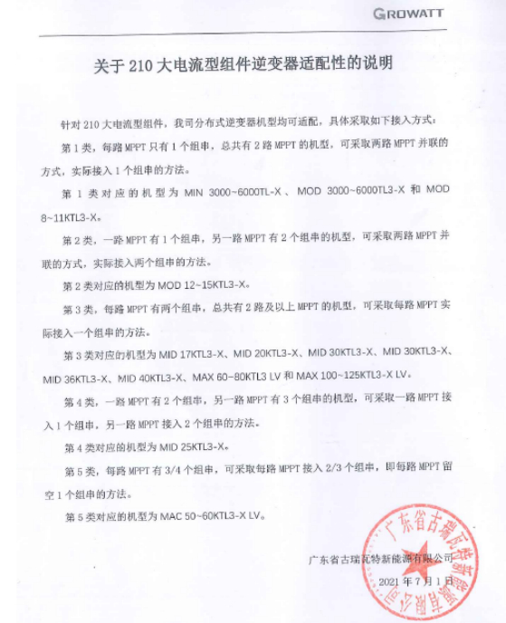 ▲8月2日,固德威发布声明,宣布目前已在供的SDT、SMT、HT系列的17kW~136kW分布式式逆变器可以匹配210超高功率组件。