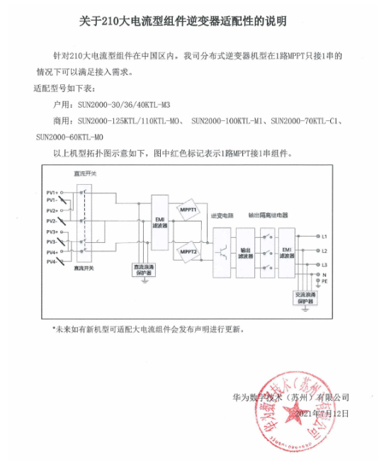 ▲7月12日,华为发布声明,其在售的30kW~125kW分布式逆变器可以可以匹配210超高功率组件。
