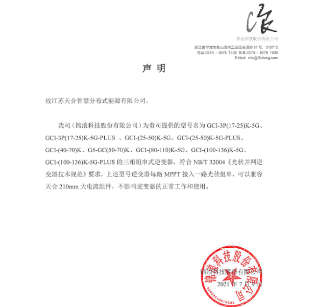 ▲7月9日,锦浪科技发布声明,宣布目前已在供的5G及5G Plusx系列的17kW~136kW分布式逆变器可以匹配210超高功率组件。