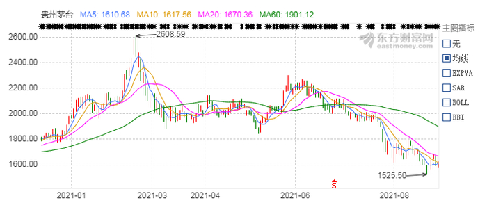 其中,在8月20日,贵州茅台出现了近一年以来的最低股价1525.50元/股。相比2月中旬出现的最高点2608.59元/股,贵州茅台年内最大跌幅超过41%,总市值蒸发了1.36万亿元。
