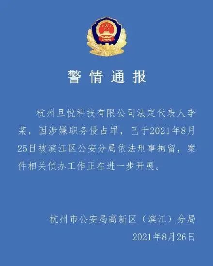 8月26日,杭州市公安局滨江区分局微信公众号发布警情通报称,杭州旦悦科技有限公司法定代表人李某因涉嫌职务侵占罪,已于2021年8月25日被滨江区公安分局依法刑事拘留,案件相关侦办工作正在进一步开展。