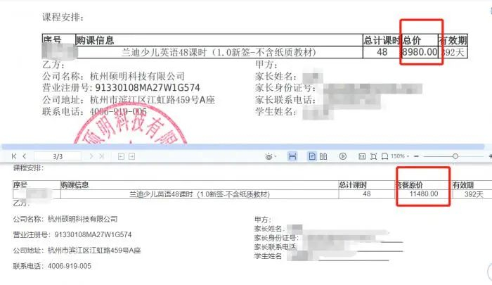 8月10日停课后,李瑞赶紧到兰迪少儿英语的官网下载了自己的电子合同。但本周她再次登录官网时,发现自己的合同被篡改了。