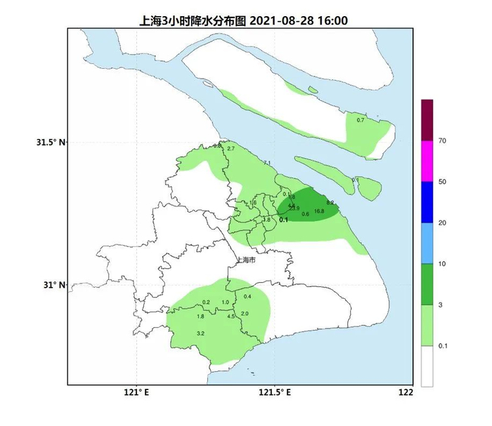 13-16时雨量图来看,降水主要在金山、市区北部、浦东北部、宝山、崇明长兴岛等地。预计今天上半夜以前,局地仍有短时阵雨或雷雨。