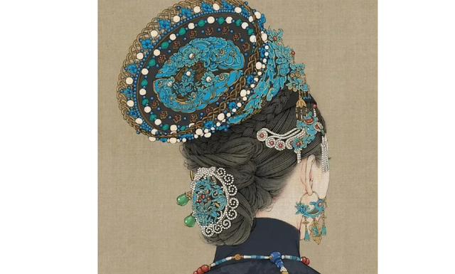 《如懿传》海报中如懿头上的发饰工艺即为点翠。但因为翠鸟为国家级保护动物,因此今天的点翠技术已经不再使用翠鸟的羽毛,而改用染成蓝色的鹅毛,或是改用“烧蓝”的工艺。