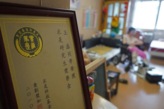 这是王磊学生时期获得的奖学金证书(8月23日摄)。
