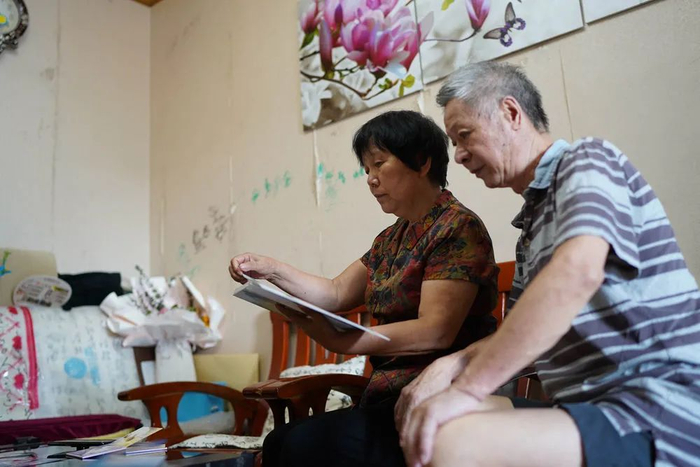 王磊的父母在家中翻看王磊以前的影集(8月23日摄)。