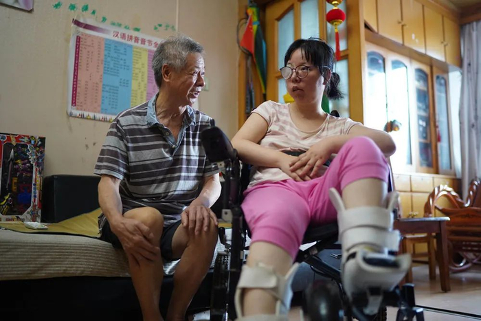 王磊(右)一边做运动器械练习,一边与父亲王伦甫交谈(8月23日摄)。