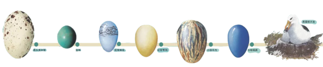 而自然界中的蛋,我们与它们接触的机会近乎为零。如果有机会接触的话——万幸,我们现在可以在网上找到很多自然纪录片来代替眼睛——就会发现鸟蛋的世界远比我们所想的要丰富得多。它们不仅有着不同的大小和形状,而且颜色缤纷,简直就像万圣节的彩蛋一样。崖海鸦的蛋是近似薄荷绿的颜色,鸻鸟蛋的颜色会让人联想到克莱因蓝,鸟蛋只需一枚蒂凡尼的商标就能成为一件珠宝。