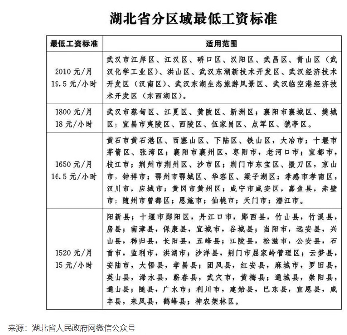 湖北省人民政府决定从2021年9月1日起调整全省最低工资标准。全省全日制就业劳动者月最低工资标准按区域划分为四档,依次为2010元、1800元、1650元、1520元。非全日制就业劳动者的小时最低工资标准依次为19.5元、18元、16.5元、15元。