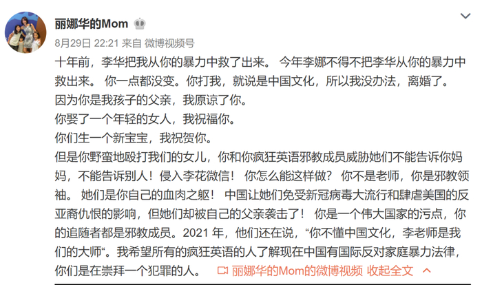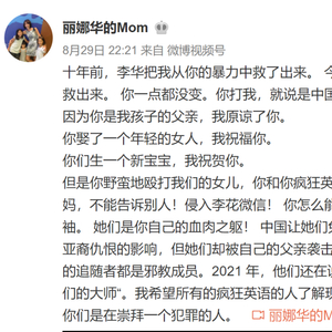 8月29日深夜,国内知名培训机构疯狂英语创始人李阳的前妻Kim发文控诉李阳家暴自己女儿。Kim说十年前自己女儿李华把自己从李阳的家暴里解救出来,十年后女儿李娜不得不把李华从李阳的家暴里解救出来,李阳一点都没改变,以前是打老婆,如今是打孩子。
