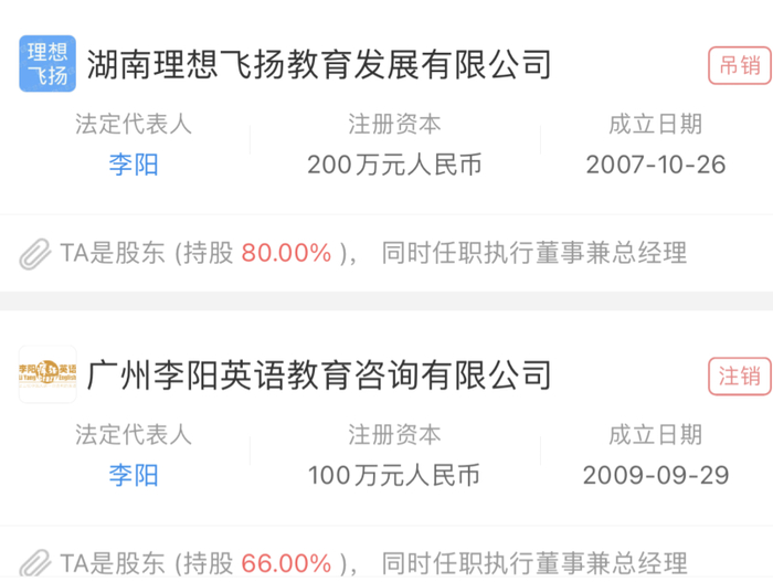 企查查APP显示,李阳共关联19家企业,其中李阳所担任法定代表人的企业共6家,目前企业状态已全部为吊销、注销状态。