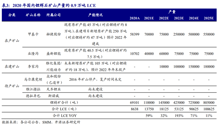 国内锂辉石资源主要集中于四川地区,虽然整体来看资源禀赋较为优异,矿石品位较好,但受限于地形地势、交通、人文等方面的原因,开发规模相对较小。现阶段,国内在产锂辉石矿山仅有两座,其中甲基卡与业隆沟矿山2020年锂精矿产量分别为5.8万吨、1.1万吨,二者合计约0.9万吨LCE。新增产能方面,甲基卡计划新增锂精矿产能约47万吨/年,预计2022年建成,同时在建的李家沟矿山也拥有锂精矿产能约18万吨/年,预计2022年年底投产,因此未来国内锂辉石产能增量将从2023年开始集中释放。随着上述项目的陆续投产,我们预计截至2025年,国内锂辉石矿山产量将达到10万吨LCE。