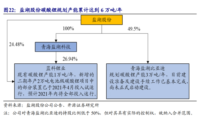 公司主营业务为钾肥和锂盐的开发、生产和销售,其中在钾肥方面,公司是国内最大的氯化钾生产企业,氯化钾设计产能达到500万吨,2020年产销量分别达到551.75万吨、644.90万吨。在锂盐方面,公司通过控股子公司蓝科锂业拥有碳酸锂产能1万吨/年,该项目以生产钾肥排放的老卤为原料,采用吸附法生产碳酸锂。同时,蓝科锂业新增的年产2万吨碳酸锂项目的部分装置已经于2021年4月投入试运行,预计2021年内全部投入运行。此外,公司另一子公司青海盐湖比亚迪(由公司与比亚迪共同设立)旗下的年产3万吨碳酸锂项目的前期准备工作已经完成,待其建成投产后,公司碳酸锂产能将累计达到6万吨/年。