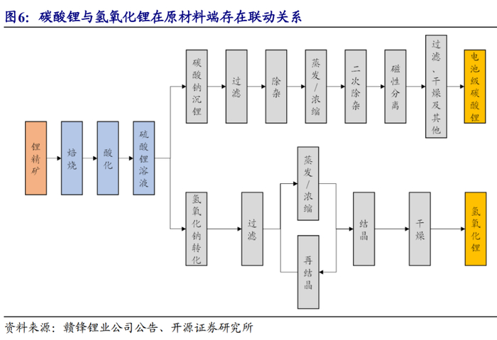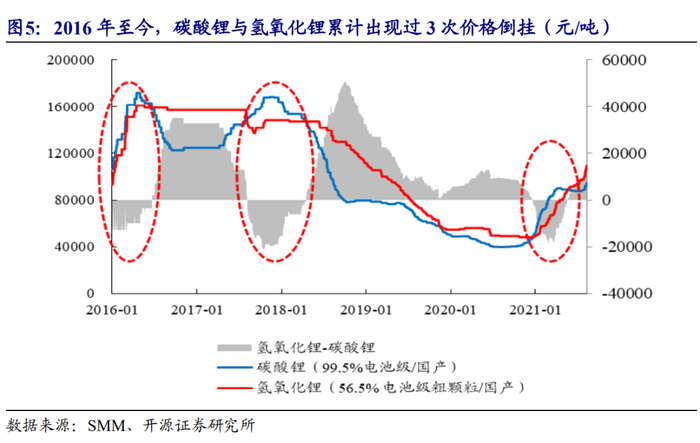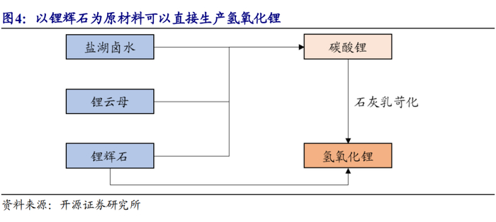 受生产工艺影响,正常情况下氢氧化锂价格会高出碳酸锂。在碳酸锂与氢氧化锂的生产工艺方面,以锂辉石、锂云母、盐湖卤水为原材料均可以生产出碳酸锂产品。而对于氢氧化锂而言,目前主流的提锂工艺中只有锂辉石可以直接一步生产得到氢氧化锂,盐湖卤水与锂云母则均需要先产出碳酸锂,再利用石灰乳对其苛化得到氢氧化锂(对应增加的苛化成本1万元/吨左右)。在历史上,氢氧化锂主要采用成本位置更高的锂辉石提锂一步生产得到,避开了低成本盐湖提锂的竞争,因此正常情况下其生产出的氢氧化锂产品价格也会比碳酸锂稍高一些。