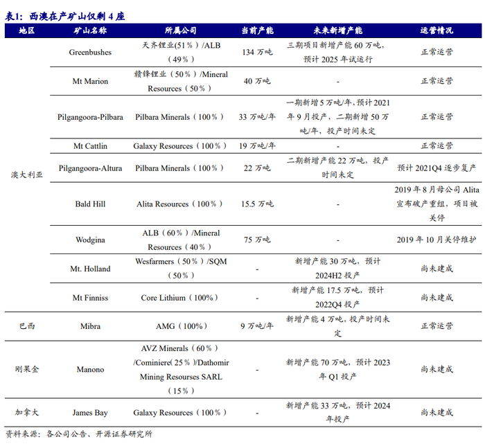 2.1、海外锂辉石:西澳在产矿山仅剩4座,增量将以建成产能为主