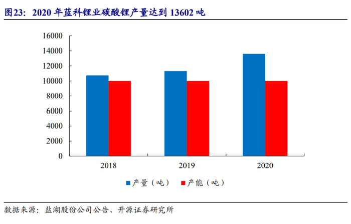 截至2020年底,蓝科锂业拥有碳酸锂产能1万吨,目前其吸附提锂工艺已得到了充分验证,实际产量已经大幅超出原有设计水平(2020年产量13602吨)。同时新增的二期年产2万吨电池级碳酸锂项目中的部分装置已于2021年4月投入试运行,预计2021年内将全部投入运行。随着二期项目的逐渐达产,我们预计2021-2023年蓝科锂业碳酸锂产量将分别达到2.4万吨、3.0万吨、3.5万吨。
