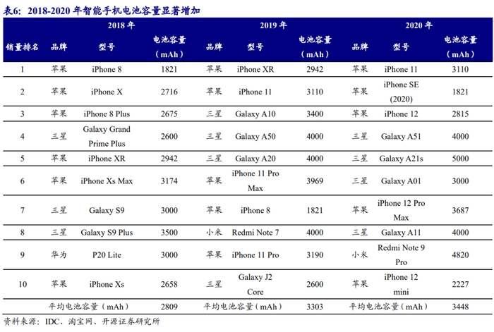 智能手机性能不断优化,单机带电量显著增加。通过对比2018-2020年全球销量前十名机型的平均电池容量,可以发现,智能手机的单机带电量出现了显著的提升,这主要是由于手机性能的不断优化对电池容量提出了更高的要求。同时IDC预计,2021年全球5G智能手机出货量将占全球销量的40%以上,到2025年将增长至69%。5G手机渗透率的提升将进一步倒逼厂商持续优化手机性能,届时智能手机单机带电量也将不断增加。