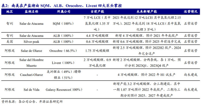相较于锂辉石提锂,得益于优异的资源禀赋条件,南美盐湖卤水提锂成本优势显著,因此其扩产步伐也更为激进。但是由于之前锂盐价格持续下跌,叠加2020年新冠疫情的影响,其资本开支也出现暂缓现象,扩产计划也多被推迟。现阶段,短期来看,除SQM的Atacama盐湖一期扩产项目(新增5万吨LCE,其中氢氧化锂8000吨)与ALB的Atacama盐湖扩产项目(新增4万吨碳酸锂)预计将于2021年底投产以外,其余扩建或者新建项目大多预计将从2022年开始陆续投入试生产。考虑到之前南美盐湖的扩产项目大多有被推迟的经历,同时新增产能也需要一定时间进行产能爬坡,我们认为,未来南美盐湖的新增供给可能会出现不及预期的情况。