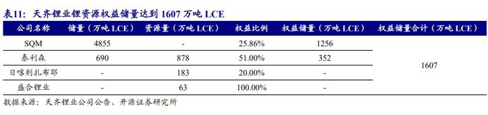 控股全球最大锂辉石矿山,锂资源储量丰富。在锂辉石资源方面,公司分别通过子公司泰里森、盛合锂业拥有Greenbushes矿山与雅江措拉锂辉石矿。其中,雅江措拉目前尚未进行开发,而Greenbushes矿山现有锂精矿产能已经达到134万吨/年,产能规模位居全球首位,同时预计2025年新增的三期年产60万吨锂精矿项目将投入运行,届时公司锂精矿总产能将达到194万吨/年。此外,公司还通过参股日喀则扎布耶20%的股权和参股SQM25.86%的股权,实现了对优质的盐湖锂资源布局。截至目前,公司锂资源端的权益储量合计已经达到1607万吨LCE。