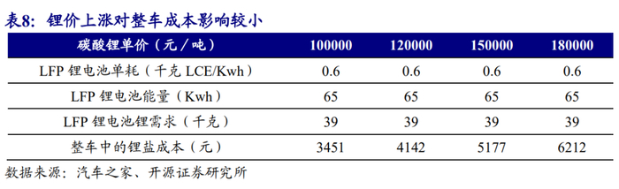 此外,整车成本对锂价变动的敏感程度较低,这也为锂价的上涨提供了重要契机。以配套磷酸铁锂电池的比亚迪汉EV为例,其电池能量为65Kwh,在碳酸锂价格10万元/吨的情况下,整车锂盐成本仅3451元。同时,碳酸锂价格每上涨1万元,其整车锂盐成本仅上升约350元,即便锂价到达18万元/吨,整车的锂盐成本也仅6212元。由此可见,锂价的上涨并不会导致整车成本的大幅上升,也不会对终端需求产生显著的负面影响。