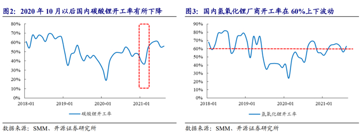 第二阶段(2021年5月至今):供给端,现阶段,全球80%以上氢氧化锂产量集中于中国,由于以锂辉石为原材料生产氢氧化锂不需要额外的苛化成本,国内90%以上的氢氧化锂都是采用这一途径生产得到。同时,目前国内锂辉石80%以上来源于西澳进口,而随着西澳锂辉石矿山产能在过去几年的不断出清,目前在产矿山仅剩4座,其中Marion产能由赣锋锂业全额包销、Greenbushes产能由天齐锂业与雅宝共同包销,只有Pilbara与Cattlin的少量散单对外供应,这导致国内氢氧化锂生产企业产能利用率始终保持在较低水平,造成氢氧化锂供给不足。需求端,欧洲发布了更严格的碳排放政策及补贴政策,美国也新推出一系列补贴政策,伴随相关政策的陆续出台,海外新能源汽车快速放量。同时,由于海外车企多为高端车型,大多搭配中高镍三元锂电池,进一步带动了氢氧化锂需求的加速释放。在上述供需双重作用推动下,氢氧化锂价格持续走强。而与此同时,由于碳酸锂生产企业开工率逐步提升,供给紧张局面有所缓解,碳酸锂价格则整体表现得较为平稳。