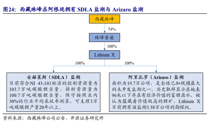 公司在阿根廷共拥有两个盐湖,其中阿里扎罗(Arizaro)盐湖位于锂矿矿藏丰富的南美“锂三角”区域,覆盖区域为19.7万公顷(Lithium拥有该盐湖3.38万公顷的勘探权),是全球已知规模最大的未开发盐湖之一,历史取样显示在地表96米以下存在有经济价值的富锂卤水,被认为蕴藏着价值极高的锂矿,目前该盐湖仍处于勘探阶段。此外,安赫莱斯(SDLA) 盐湖的资源储量同样十分丰富(合计资源量达到200万吨LCE以上),目前其年产2500吨LCE的富锂卤水项目已经达产,可以稳定产出锂浓5.5%-6%的老卤产品并实现部分产品销售至国内客户。同时,SDLA盐湖的年产2.5万吨LCE基础锂盐产品项目也已经完成可行性研究报告,正处于前期筹备阶段,待其建成,预计公司锂盐产品产能将达到2.75万吨LCE。