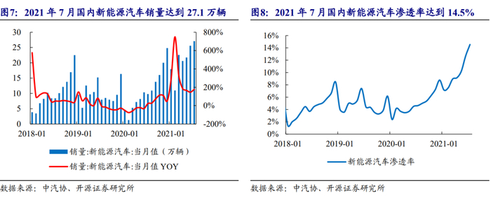 国内新能源汽车销量连续13个月环比大幅增长,渗透率呈现快速提升趋势。根据中汽协统计数据,2020年国内新能源汽车销量达到132.29万辆,在上半年疫情冲击背景下,全年依旧同比增长9.69%。同时,自2020年7月份以来,国内新能源汽车销量已经连续13个月实现同比大幅增长,截至2021年7月单月销量已经达到27.1万辆。此外在渗透率方面,2020年1月至今,国内新能源汽车渗透率整体呈现快速提升趋势。2021年7月国内新能源汽车渗透率已经达到14.5%,1-7月渗透率也累计达到9.9%。