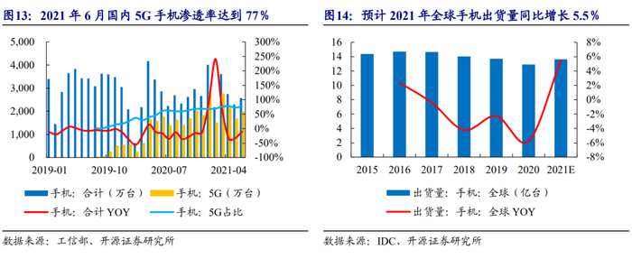 乘5G东风,全球手机行业景气度持续复苏。根据国家工信部数据,2021年6月国内手机出货量达到2566万台,其中5G手机出货量1979万台,市场渗透率高达77.12%。随着5G浪潮的来临,手机行业景气度持续复苏,2021年1-6月国内手机累计出货量达到1.74亿台,同比增长13.73%。此外在全球方面,根据IDC统计数据,受新冠疫情影响,2020年全球手机出货量降至12.92亿台,同比下降5.76%。IDC预计,随着市场需求的持续复苏以及5G渗透率的持续提升,2021年全球手机出货量将同比增长5.5%,同时2020-2025年年均复合增速也将达到3.6%。