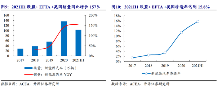 碳排放目标趋严叠加政策优惠,推动欧洲新能源汽车快速放量。2019年以来,以德国、英国、法国为代表的欧洲主要国家针对新能源汽车产业出台了一系列优惠政策,包括税收减免、购车补贴、基础设施建设补贴等,促进了新能源汽车产业的迅速发展。同时,2020年9月欧委会正式发布《2030气候目标计划》,进一步收严碳排放目标。在相关政策刺激之下,欧洲新能源汽车销量实现了迅速增长。根据ACEA数据,2020年欧盟+ EFTA +英国全年销量合计达到136.5万辆,同比增长达到142%,2021H1销量达到102.9万辆,同比增长157%。同时在渗透率方面,2021年H1欧盟+ EFTA +英国的新能源汽车市场渗透率已经达到15.8%,未来随着新能源汽车的加速放量,渗透率有望持续提升。