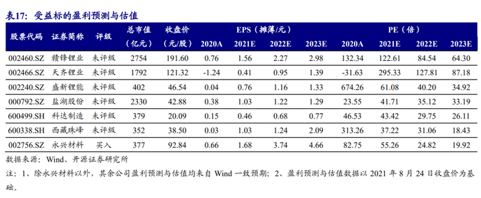 氢氧化锂价格不会单独走强,碳酸锂有望继续跟涨。虽然近期氢氧化锂价格持续走强,但是我们认为其价格并不会一枝独秀,主要原因体现在两方面:(1)以锂辉石为原材料既可以生产碳酸锂也可以生产氢氧化锂,虽然二者工艺路线与采用的生产设备有所不同,但最终的生产成本大致相当。因此从长期来看,二者在原材料端的联动会导致其价格走势趋于一致。(2)碳酸锂与氢氧化锂在产品相互转化方面并无太大技术障碍。以碳酸锂转化为氢氧化锂为例,只需增加额外的设备,利用石灰乳进行苛化(对应苛化成本1万元/吨左右),便可通过碳酸锂转化得到氢氧化锂。由于这种产品之间的相互转化技术难度较低且成本适中,因此二者之间很难出现较大价差。我们预计,随着锂盐需求的不断增长,未来碳酸锂价格也有望继续跟涨。