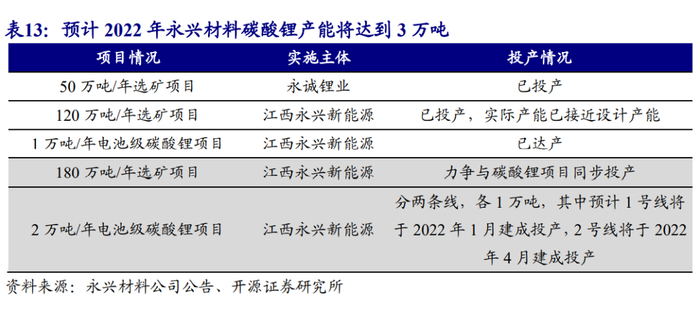 积极推进产能扩张,碳酸锂二期项目蓄势待发。在选矿方面,目前公司产能170万吨/年(永锂矿业50万吨+永兴新能源120万吨),这不仅可以满足下游1万吨/年碳酸锂生产项目的锂精矿需求,也为碳酸锂产能的进一步扩张提供了保障。同时,公司二期“年产2万吨电池级碳酸锂项目”及配套的“180万吨/年选矿项目”正在积极推进中,预计将于2022年1月与2022年4月分批投产。随着公司在建产能的集中释放,我们预计2021-2023年公司碳酸锂产品销量将由2020年的9612吨(含试生产期间销量1481吨)分别提升至1.3万吨、2.5万吨、3.2万吨。