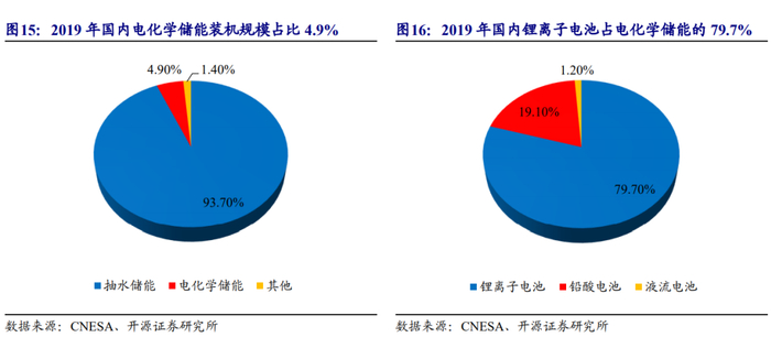 锂离子电池已经成为电化学储能的主流方向。按类别来看,储能技术可以分为物理储能与化学储能,其中物理储能主要为蓄水储能(2019年国内装机规模占比达到93.7%),化学储能也主要可以分为锂离子电池、铅酸电池与液流电池。相较于铅酸电池,锂离子电池虽然成本略贵,但是得益于较高的能力密度与较多的循环次数、较长的使用寿命,其综合性价比已经明显高于铅酸电池。随着锂离子电池对铅酸电池替代进程的不断加快,锂离子电池已经逐渐成为电化学储能的主流方向,截至2019年,国内锂离子电池已经占到电化学储能的8成左右。