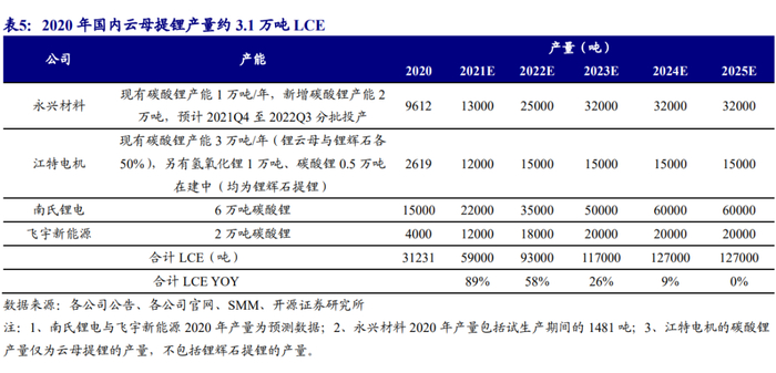 国内锂云母资源储量丰富,主要集中江西宜春地区。根据华夏经纬网数据,宜春地区可开采的氧化锂储量为260万吨,约占全国的50%、世界的25%。此前受提锂技术的限制(云母提锂过程中容易形成难溶氟化物,容易腐蚀生产设备并且导致收率较低,同时还会产生残渣污染),云母提锂并未得到充分的重视与推广。但近几年来,以永兴材料为代表的企业经过长时间的技术研发与创新,一步步攻坚克难,最终攻克云母提锂技术难题,云母提锂也实现了规模化生产。目前主要的生产企业包括永兴材料、江特电机、南氏锂电、飞宇新能源等,产能均达到上万吨,2020年国内云母提锂的整体产量规模约3.1万吨LCE。随着未来新增产能的投产以及现有产能利用率的逐步提升,国内云母提锂产量规模有望进一步扩张,我们预计截至2025年将达到12.7万吨LCE。