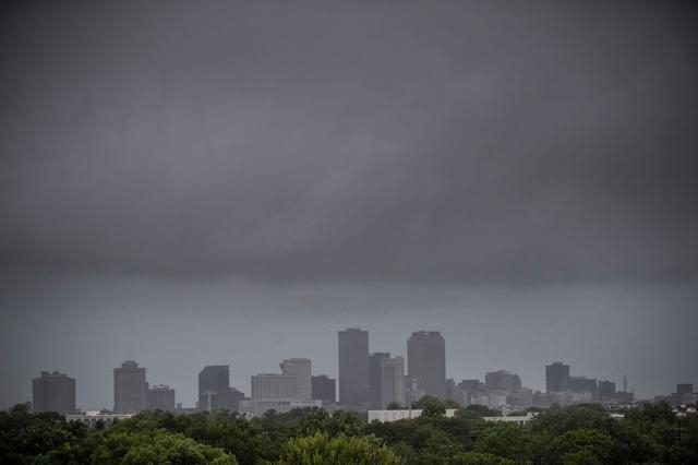 周日,在飓风艾达到来之前,一堵雨墙在新奥尔良市中心上空移动。