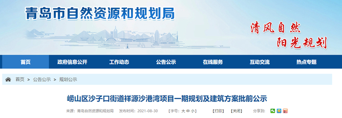 中国质量新闻网讯(郭婧欣)近日,青岛市自然资源和规划局发布关于崂山区沙子口街道祥源沙港湾项目一期规划及建筑方案的批前公示。项目位于青岛市崂山区沙子口中心渔港以西,建设内容涵盖酒店、商业和办公,着力于打造集文化体验、休闲养生、旅游度假、精品商业为一体的海洋休闲度假港湾,成为国内一线海滨旅游目的地。