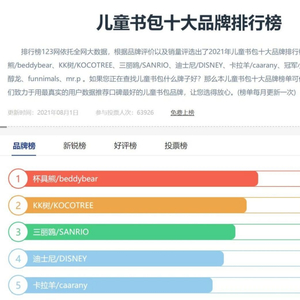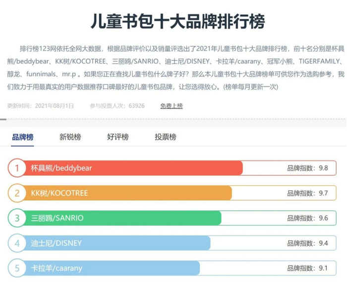排名前十的儿童书包品牌里,杯具熊/beddybear、kk树/KOCOTREE、三丽鸥/SANRIO、迪士尼/DISNEY、卡拉羊/caarany、冠军小熊、TIGERFAMILY、醇龙、funnimals、mr.p中,除两家是中国名字外,取的都是洋名。