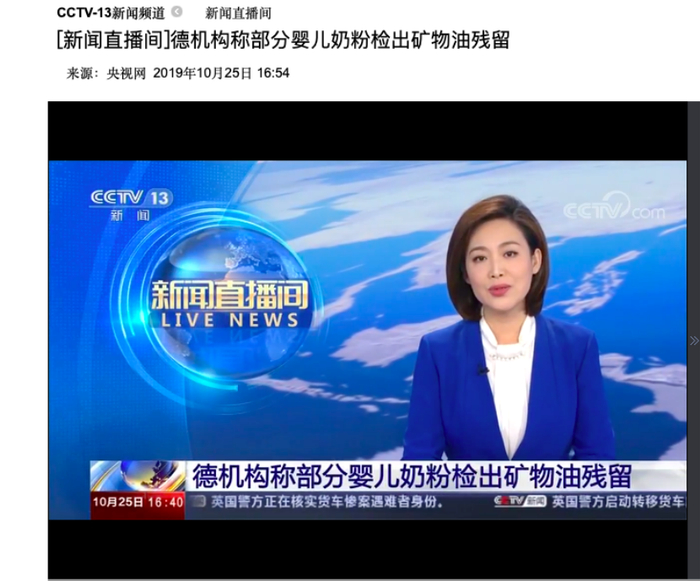 新华社在2019年10月报道,总部位于德国的公益组织“食品观察”24日在官网发布一份调查报告称,该组织对购自多国的婴幼儿奶粉进行检测,在部分奶粉中检出芳香烃矿物油残留物。