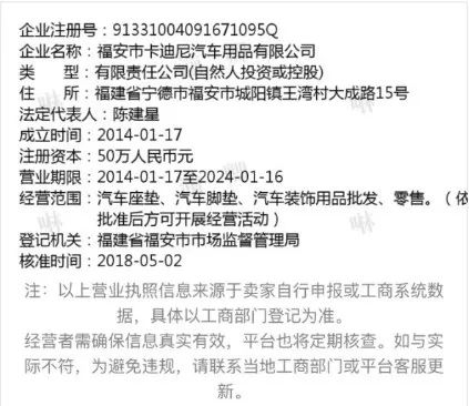 然而,当记者打开dwarfoo店铺首页,发现其产地写明是中国大陆,据其提供给电商平台的工商资质等公开信息显示,这是一家由中国人投资或控股的汽车用品公司,成立时间为2014年,注册地址为福建省福安市。登记机关则为福建省福安市市场监督管理总局。