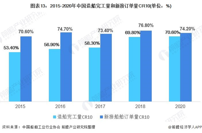 近年来,我国船舶制造行业的市场集中度持续提高。2020年,造船完工量前10家企业占全国总量的70.6%、新接船舶订单前10家企业占全国总量的74.2%、手持船舶订单前10家企业占全国总量的68%,新接订单向优势企业集中趋势明显。