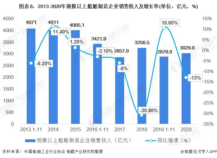 不同于船舶工业其他业务的增长态势,2013-2020年,我国规模以上船舶制造企业的销售收入呈波动下降趋势,作为传统制造业的船舶制造行业持续低迷。