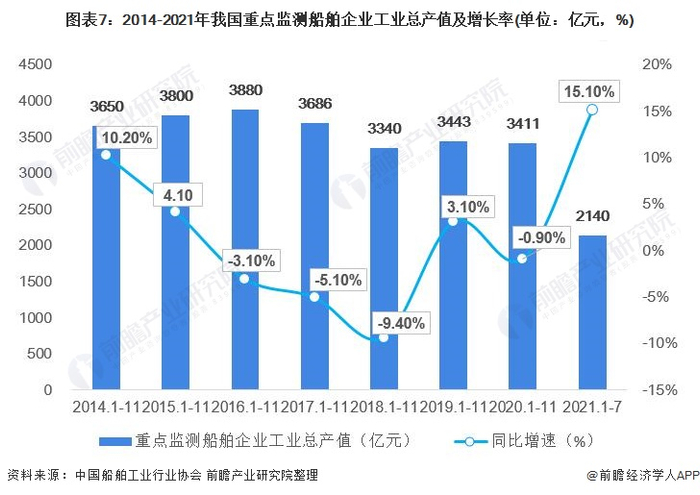 2021年1-7月,75家重点监测船舶企业完成工业总产值2140亿元,同比增长15.1%。其中船舶制造产值931亿元,同比增长16.2%;船舶配套产值174亿元,同比增长20%;船舶修理产值81亿元,同比下降10.9%。