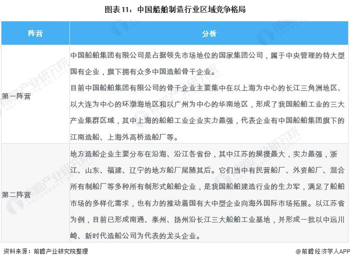 从发展情况来看,我国船舶制造行业目前的竞争格局是央企、地方造船企业、民营造船企业“三足鼎立”的格局。央企是中国船舶集团有限公司,地方造船企业和民营造船企业则主要分布在长三角和珠三角地区,如江龙船艇、扬子江造船、新时代造船、金海湾船业等。