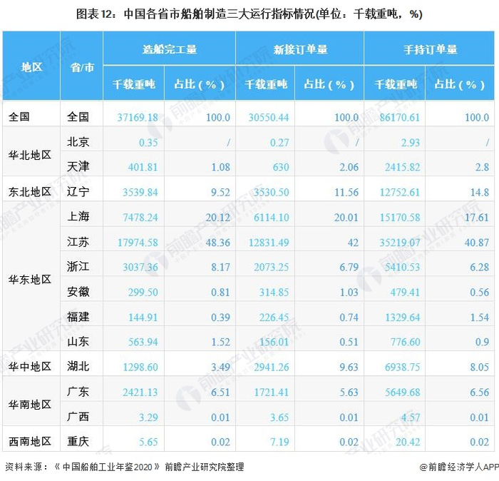 从船舶制造行业总体运行情况来看,据《中国船舶工业年鉴2020》所统计的2019年情况来看,华东、东北地区和华南地区的造船完工量、新接订单量和手持订单量占据了全国相当的份额,其中又以江苏省、上海市、辽宁省、浙江省、广东省等占比较多。