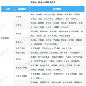 现代船舶种类较多,可按船体材料、航行区域、动力装置、推进方式、航行状态、用途等方式对船舶进行分类。其中,最能说明船舶特征的是按照船舶的用途来进行分类,具体参见下表。