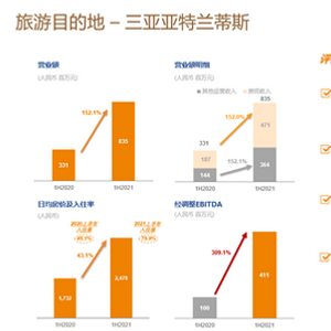 Club Med中国大陆地区上半年营业额较2020年同期增长了172%;三亚亚特兰蒂斯收入达到8.35亿人民币,相比去年同期成长了152%,EBITDA也就是利润水平达到4.1亿人民币,EBITDA ratio已经接近50%。在2021年7月,三亚亚特兰蒂斯的营业额约为2.33亿元,较2020年7月增长约57.6%;房间入住率为96%,高于2020年同期的88.1%,创历史新高。