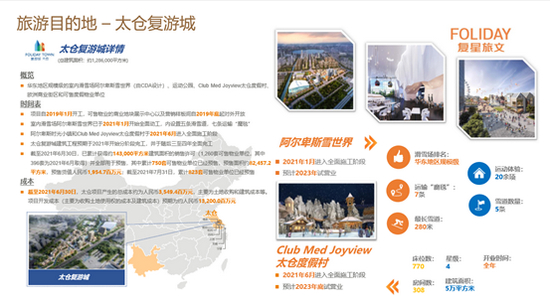 同时,公司两个自建项目:太仓复游城和丽江复游城,工程也在如期的施工中。丽江复游城中的Club Med 丽江度假村预计今年秋季可以开业;飞越驼峰主题商业街和雪山秘境主题公园预计在2023年底前开业。太仓复游城打造的华东地区规模级滑雪场“阿尔卑斯雪世界”和Club Med太仓度假村都将在2023年底前营业。